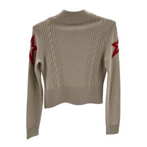 Perfect Moment Tan Merino Wool Cable Underwear Sweater Size S: lightweight cable knit, intarsia star pattern, mock neck and long sleeves, ribbed edges, measurements: 15.5 inch bust x 18 inch length.