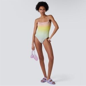 Stylish swimsuit with a beautiful gradient of pink, yellow, and green. Perfect for beach days.