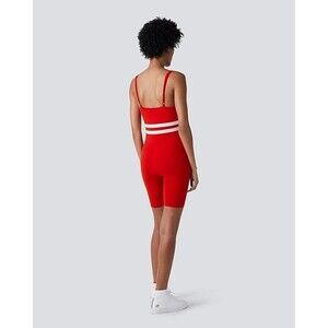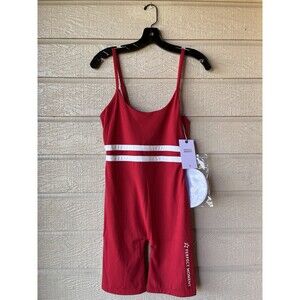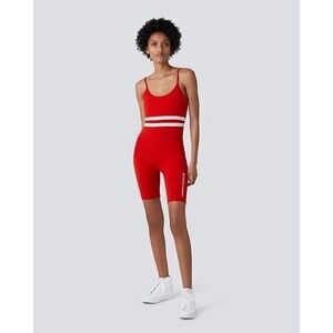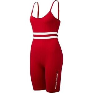 New with Tag, list price $200, Perfect Moment women's Red with White Stripes Sleeveless Workout Shorts Romper Fitness Suit, size Small, soft stretch knit moisture wicking quick-dry fabric, scoop neck & back with adjustable spaghetti straps, shelf bra with removeable cup pads, hidden zipper left side.