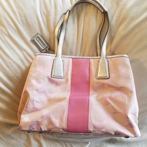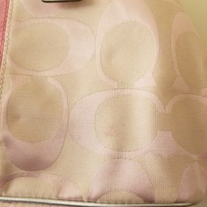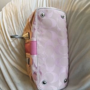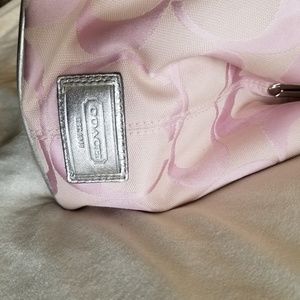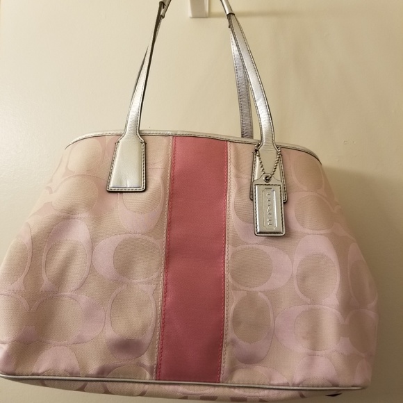 Adorable Pink Hand Bag with silver handles and clutch purse made in the middle which is perfect for hiding personal items. Used this purse twice and has a slight smudge stain (see picture). There are 4 inner pockets including the clutch with a shiny pink lining throughout.