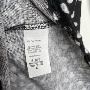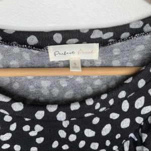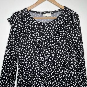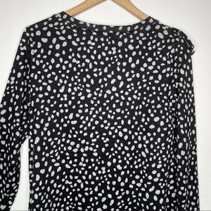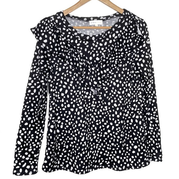 It features: long sleeves, crew neck, polka dot pattern, ruffle detailing, black & gray color