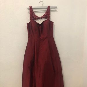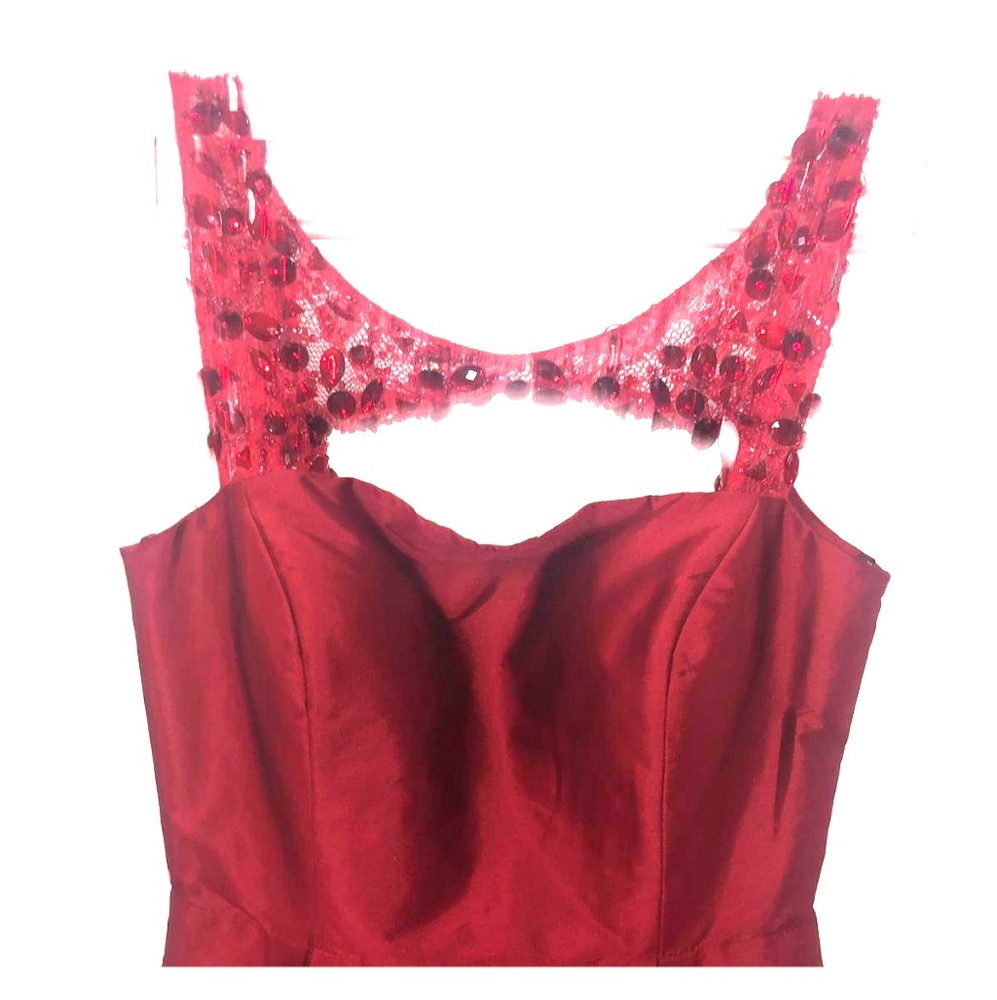 Long fine red dress with beautifull detail short sleves with stuning ruby simulation. An amazing semi-open back part also with jewerly where is located the zipper for best opening of the dress. The best part? It has pockets on both sides! ❤