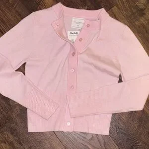 Baby pink cardigan with a classic button-front closure. Ribbed hem and cuffs provide a secure, polished fit. Crew neckline and long sleeves make it easy to layer for everyday wear. Subtle, versatile color pairs well with many outfits.