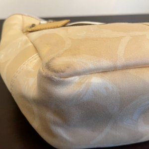 OMG! I LOVE this bag! It's a gorgeous pale yellow color with beige accents and brass hardware. It has a front zipper, a back magnetic button, and a zipper for the main compartment. The bottom corners show some use but does not affect the bag. Dimensions are 14" wide, 9" tall, 4" depth. Handle drop is 7". Perfect for springtime!