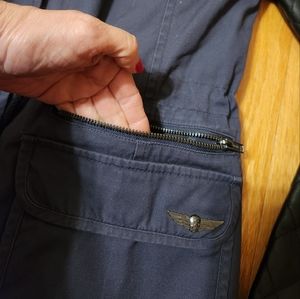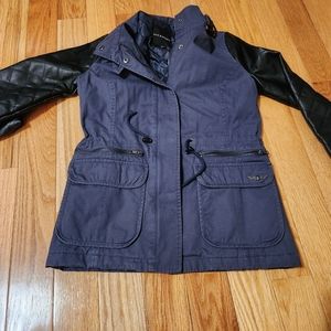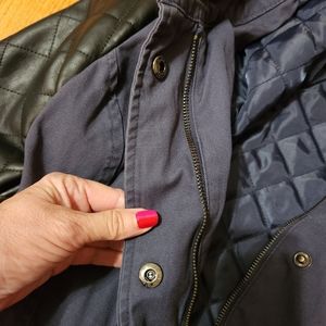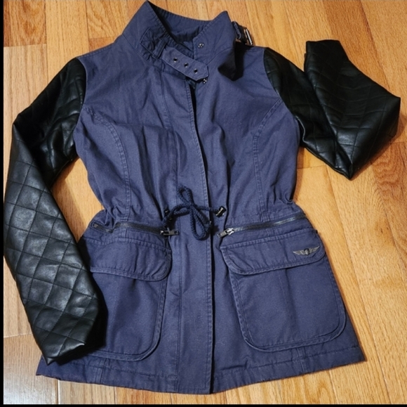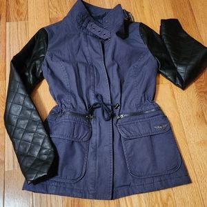 Excellent condition. Body of jacket is a dark blue-ish/ gray color. Faux leather quilted sleeves are black. Draw string waist can be pulled tighter to show off more of your waist. Or opened to have more of a straight & not fitted look. Fits true to size!