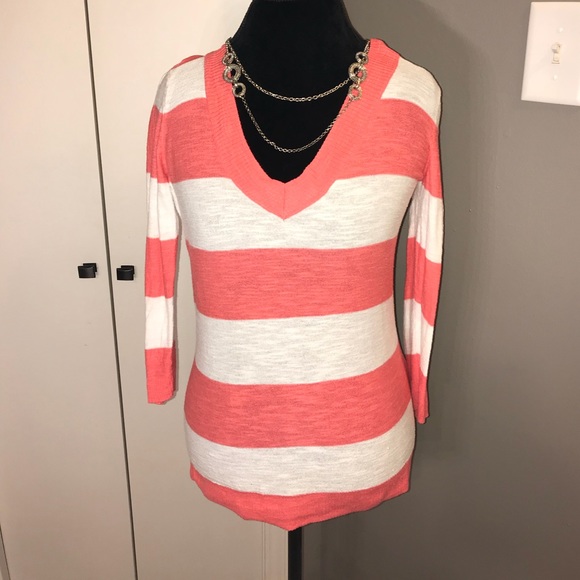 Coral& white striped light weight v-neck sweater, cami to be worn underneath. NY &Co