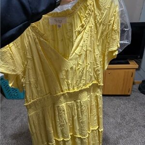 Vibrant yellow maxi dress. Features subtle embroidery. Ideal for sunny days.