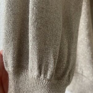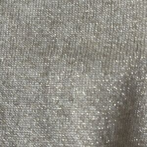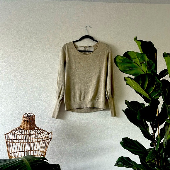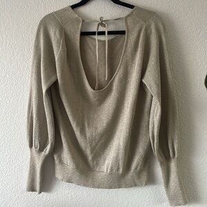 Ties at back. Slight gold sparkle. Tan. Light sweater. Cuffed sleeves. Low back shows a little bit of back but not your bra or bra straps. Has a little bit of puff at bottom and helps to hide the muffin top but isn’t bulky. Wear it with white and it’s perfect for a cool summer night date or wear it with black to go out with the girls. Appropriate as work attire too. I wore it once and love it but never had the chance to wear it again. Size medium
