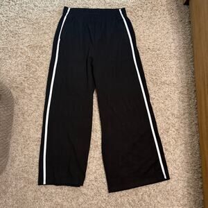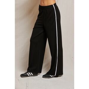 features: pull on wide elastic waistband; contrast grosgrain trackpant stripe down the outer leg; side welt pockets.