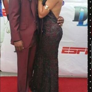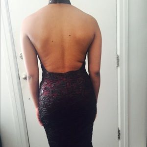 Elegant halter back black lace gown. Only worn once for Prom and in excellent condition. Custom made - Measurements 35/27/36.