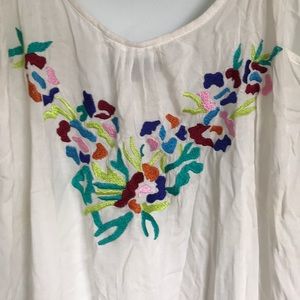 Spaghetti strap flowy beach dress with embroidered detail. Perfect for summer!! One very very small marking near bottom of dress that is barely noticeable/ could easily be fixed