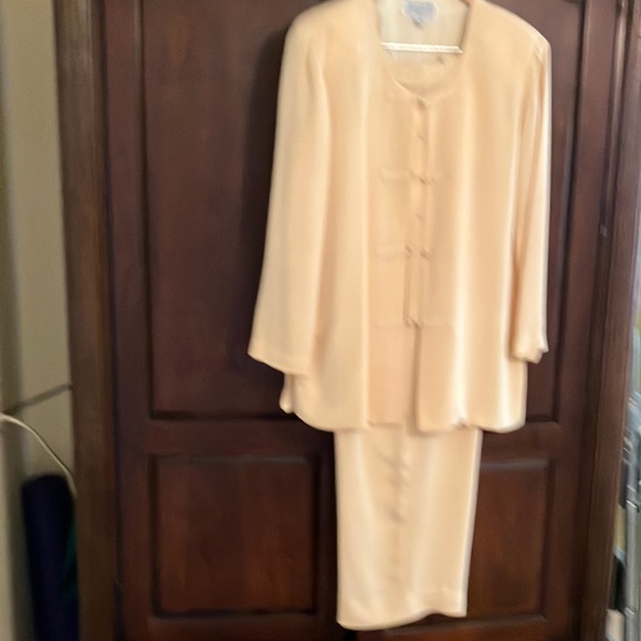 Sake Fifth Avenue silk pantsuit. Pale yellow. Frog fasteners,wide legs.