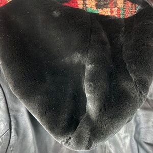 Cinched-Waist leather is in for fall and this is the perfect 90s-2000s vintage jacket! In amazing condition, real leather, faux fur lined hood, and quilted lining from Sonoma. Size L. Hits right at hips or a little lower. Black leather. Pockets and padded lining at the bottom for added warmth.