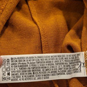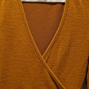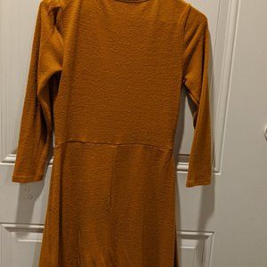 This dress is a lovely ochre color, like orange marigolds. It is like a sweater dress. It goes great with tights and boots! Worn only a couple of times. In excellent condition with no defects. All my items are from my personal closet and have been cared for with love. Pet and smoke free home.
