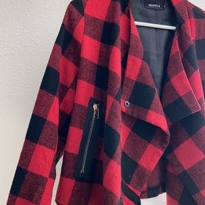 Buffalo plaid fall jacket. Super cute zippers and can even tie it if you want. Longer in front. SO cute!