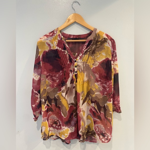 This semi sheer fall top is absolutely adorable on. It is a beautiful pattern mix of fuchsia, maroon, mustard, and other fall colors. Make an offer before it’s gone.