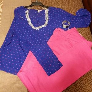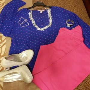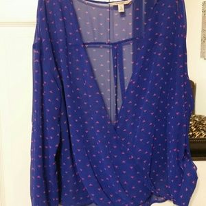 Cobalt Blue with hot pink triangles. Drops low in front, i wore a hot pink basic tank top underneath. Sleeves can be worn long or cuffed and secured with the strap & button inside each sleeve. Shirt is see through..very light & airy.