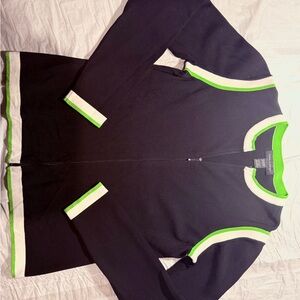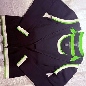 Stylish black zippered cardigan with bold green and white trim. Perfect for work or for casual wear made of 62% viscose 38% nylon.