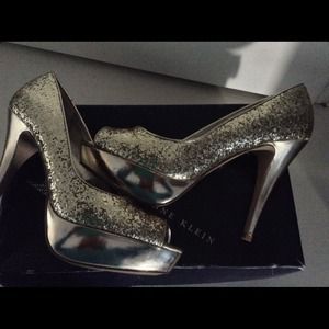 Beautiful glitter gold open toe shoes worn once the perfect party shoe 1" front platform n 4" high heels n new shape in n out .