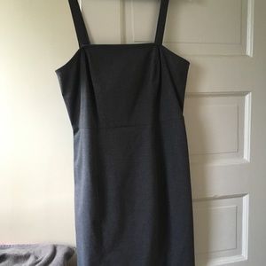 Warm grey color, soft fabric. Short seem, thin straps. Super cute office wear paired with a cardigan.