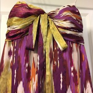 Multi color soft maxi dress. Strapless with a sweetheart neckline, tie can be a bow in front, tied around your neck like a halter or a cute back bow. I received a lot of compliments wearing this dress.