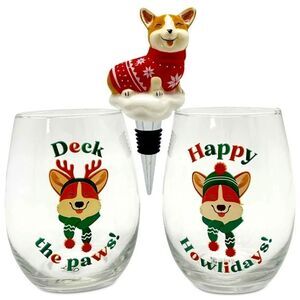 Celebrate the season with this charming Corgi-themed set of two stemless wine glasses and a bottle stopper from TMD Holdings. A fun gift for the holidays, present it as is or add in a bottle of wine (sold separately).