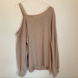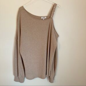 Perfectly Priscilla SHES PERFECT Taupe Knit Pearl Open Shoulder Sweater Plus 1XL