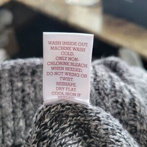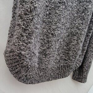 It is a marled black/white knit, crew neck, and long sleeves.  The bottom is curved up at the sides a little.