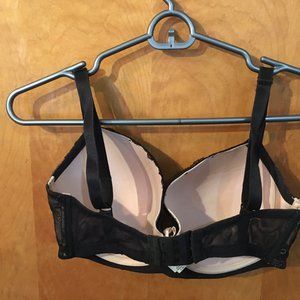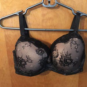Floral lace-covered contour cups. 3 hook, 3 column back closure. Underwires and boning in the side seams. Has black shoulder straps rather than the light pink shown in the model picture.