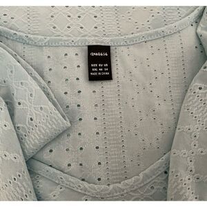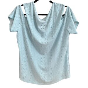 Summer perforated cold shoulder light blue blouse with silver ring embellishments. 14 22” X 26”
