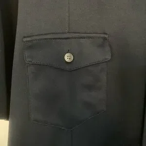 Hundred percent polyester button down short sleeve. Two breast pockets with button closure. Slim fit.