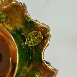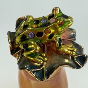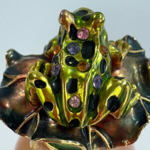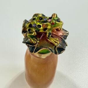 Beautiful perfume bottle with a green metal spotted frog on a metal lily pad. The frog has different colored rhinestones on it.
