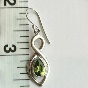 An attractive hourglass shaped earring, sterling silver set with peridot in a brilliant apple green.