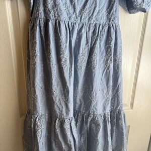 This dress is stunning. Perfect for summer or a vacation. Beautiful periwinkle blue color with embroidered eyelet style floral design, double-lined heavier in weight, well-made. Short puff sleeve, tie back detail, tiered hem.