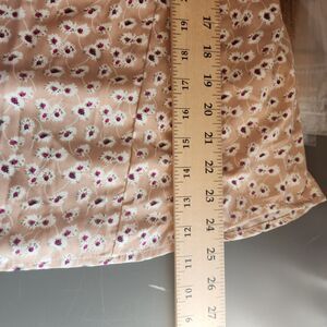 The product is a small, blushed pink ruffled cottagecore Fairy long sleeve blouse from the brand Periwinkle. It features a V-neckline and is made of polyester material. This basic style blouse is designed for women in a regular size small, perfect for adding a touch of whimsical charm to any outfit.