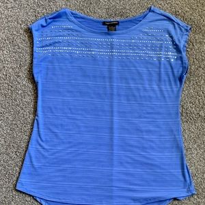 This pretty boatneck top has decorative silver-tone beadwork across the front. Polyester l/spandex top is silky and has good stretch. In great condition.