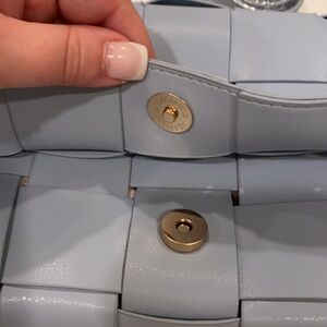 Only worn for photos - color is a light blueish gray (my photos with me holding the bag have been brightened and were outdoors for a more accurate color during daylight, photos on counter top are indoors at night)