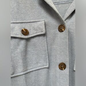 Stylish periwinkle shacket featuring front pockets and a classic collar. Perfect for casual wear.