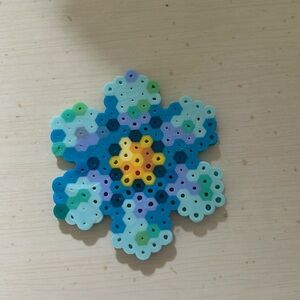 Contains one Perler Bead bee, one Perler bead flower, and one Perler bead honeycomb piece. The bee is about 3.25 inches by 3 inches. The flower and the honeycomb piece are about 2.75 inches by 2.75 inches.