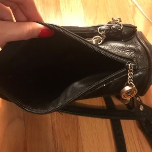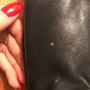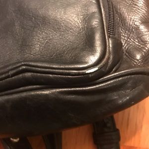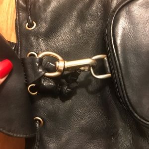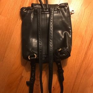 Navy leather backpack purse with clip closing and drawstring on top. Zip pocket in the front. Backpack can be opened on the side via zipper. A few flaws as shown in pictures