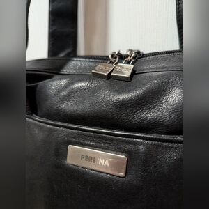 Hardware: Silver-toned hardware, including the brand name plate "PERLINA".