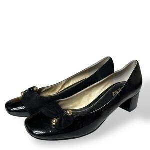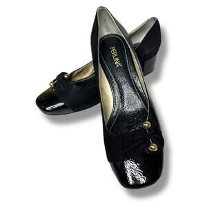 Perlina Pumps Peaches Low Block Heel Gold Details Suede and Patent Leather Womens Size 9.5M