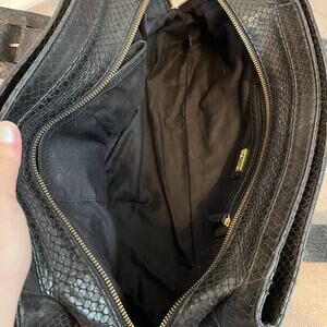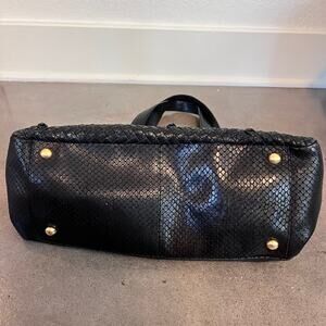 Perlina woven embossed Genuine leather black snake skin shoulder bag womens purse medium size, gold studded hardware, 3 snap pockets, main pocket with zipper closure, inner zipper pocket. Excellent like new conditions