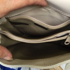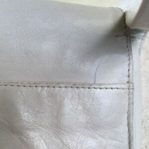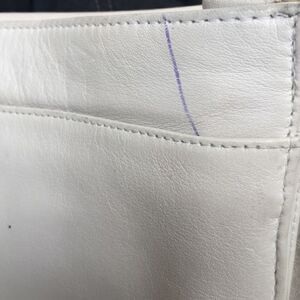 White leather that needs cleaning with tan leather inside which is perfect. Under the flap when you open it is a penmark also on the back a tiny one, shown in pictures