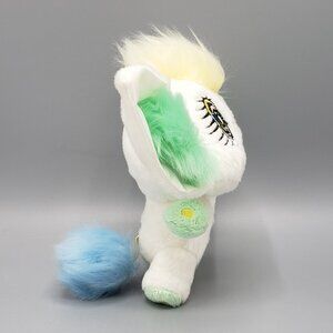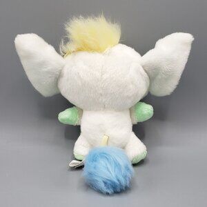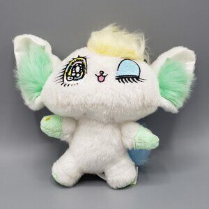 This is the Sprawled Out Rue version of the PeroPero Sparkles mascot plush from Clever Idiots. It is a kawaii cat from the artist Yurie Sekiya. The Japanese chibi toy has a white body, pastel green and yellow fluffy hair, pastel blue pom tail, and is winking one of its wide eyes. Made of polyester fibers and plastic pellets, this stuffed animal measures approximately 5-1/2" long and 7" wide.