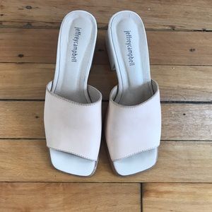 These mules are similar to Jeffrey Campbell's current Perpetua shoe, however as you can see the heel is a slightly different shape. They are a pale pink almost nude leather. Great as a summer basic! Fit is small for an 8