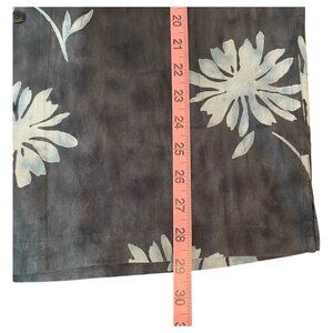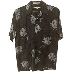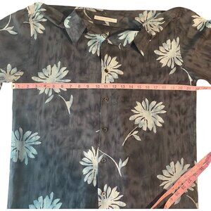 This Men's Perry Ellis 100% Silk Short Sleeve Hawaiian Tropical Shirt in size S features a floral pattern, collared neckline, button closure, and multicolor design. Made from lightweight and breathable silk fabric, this woven shirt is perfect for a beach, vacation, Hawaiian, or tropical theme. The regular fit and button-down collar style add a touch of style to this casual button-up shirt, making it a great addition to any man's wardrobe. Measurements: Pit to Pit: 22" Length: 29.5" Color: Charcoal Grey with Light Blue/Grey Flowers Size: Small