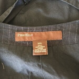 Perry Elllis men’s 100% linen black V neck button down vest. You can Elevate your style with this sleek black pinstripe vest. Perfect for formal occasions or adding a touch of sophistication to your outfit. Size XXL