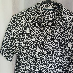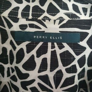 The Perry Ellis Abstract Button-Front Shirt in Men's Size XL features a geometric pattern in black, making it suitable for casual occasions during the summer, fall, or spring. Made of cotton, this short sleeve shirt has a collared neckline, button closure, and a regular fit. It is machine washable and designed with a point collar style, showcasing a designer and abstract theme. The shirt does not have a vintage appeal and is accentuated with button details, adding a stylish touch to the overall look.