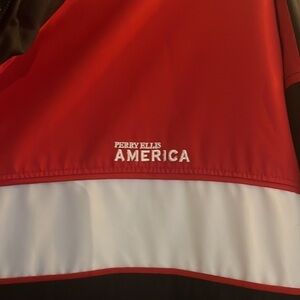 Perry Ellis America, windbreaker jacket, zip up, size 3 XL. Red, white, black.